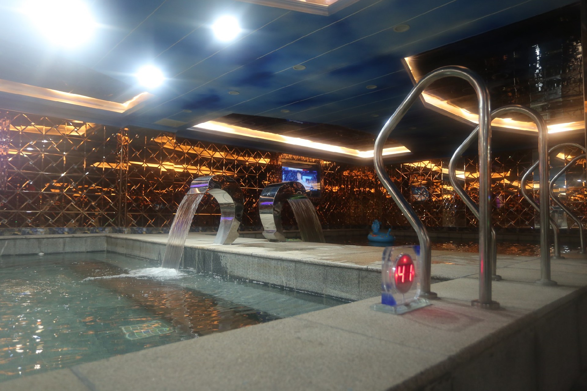 本項目施工包含四個溫泉浴池,選用國內外最先進的循環水處理系統設備,保證水質達到國家衛生安全要求,響應國家煤改電號召,配備超低溫空氣源熱泵熱水機組進行浴池加熱及恒溫,濕蒸房采用進口芬林蒸汽機制熱,二樓蒙古包汗蒸房采用專業發熱電纜制熱,添加負離子粉,麥飯石粉,采用巴基斯坦鹽磚,紅毛玉磚,玉石片,瑪瑙片等粘貼裝飾,頂部留白邀請農業大學教授采用中式繪畫及毛筆書法,營造江南水鄉,塞北草原,映日荷花,韓式風情,傲骨梅花等風情。